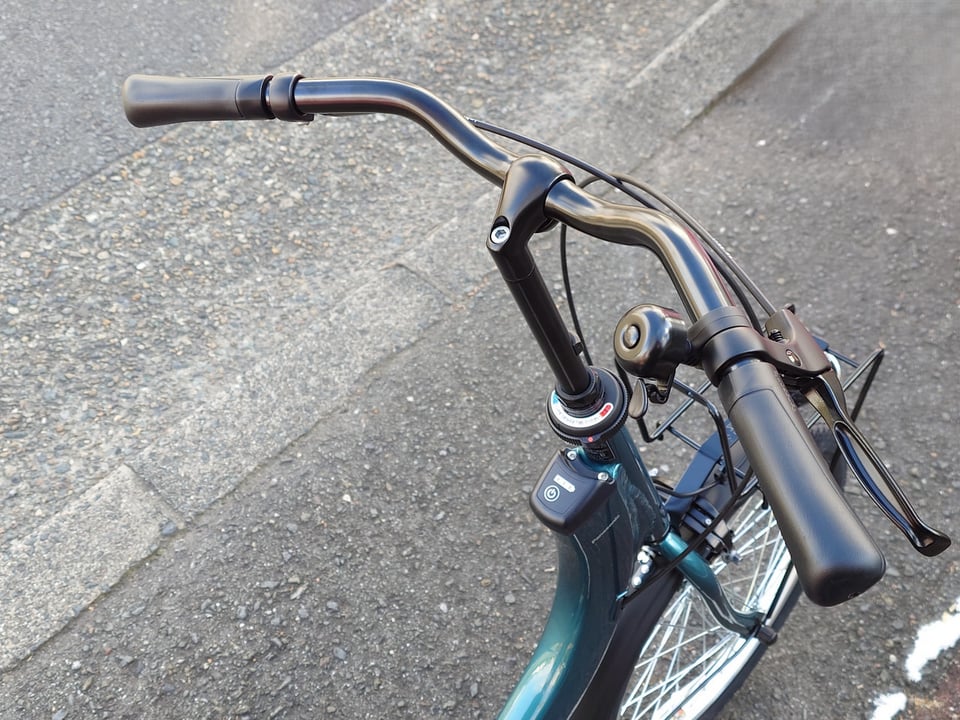 ハンドルはママチャリのぐぐっと手前に曲がっているものと、シティー車に取り付けられることの多いまっすぐなハンドルの中間ぐらいになっています。