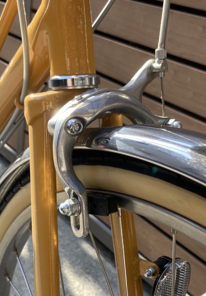 ツーピポットキャリパーブレーキが装着されていて、プレートが厚く支点が二つあるので、しっかりとブレーキが効き調整のズレも少ない安全、安心の前ブレーキとなってます。
