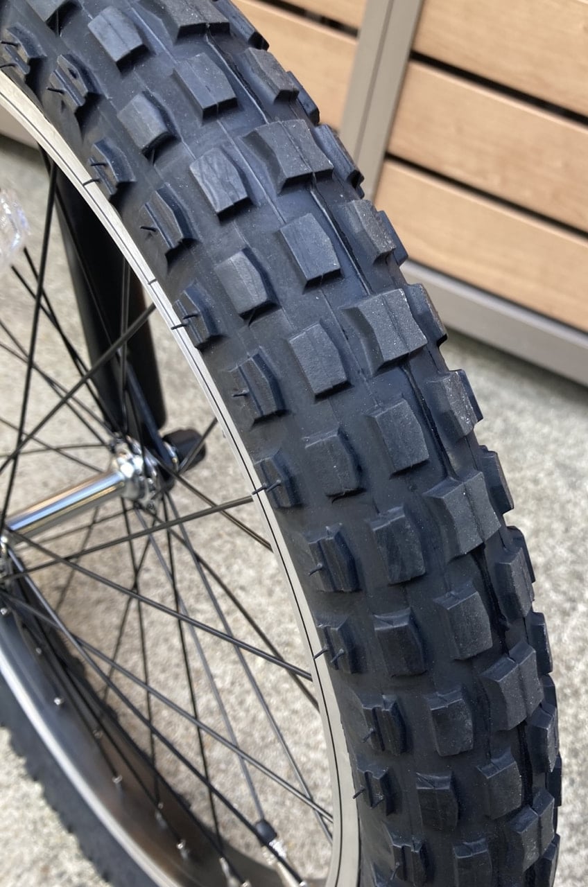また、タイヤがカッコいい!20×2.125サイズの極太タイヤで、ゴツゴツしたブロックパターンのタイヤはEZの個性を主張するワイルドなタイヤとなってます。ゴツゴツしたタイヤですが乗り心地が悪いという事も無く太いタイヤが細かい路面からくる振動を吸収してくれるので、意外と快適に走れちゃいます。![]()