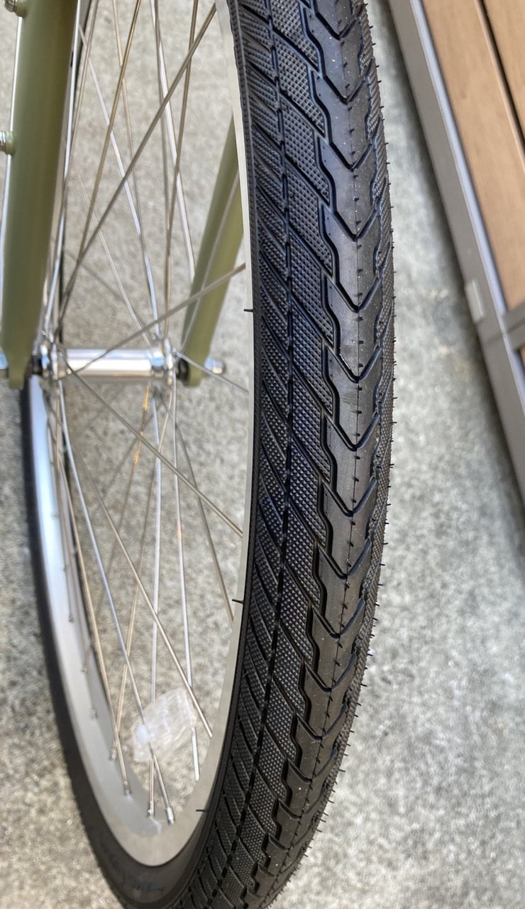 軽量なスポーツタイヤで漕ぎ出しが軽く、適度な衝撃吸収性を備えた1.75幅。空気を入れるバルブは英式で普通の自転車と同じ感覚で扱えます。