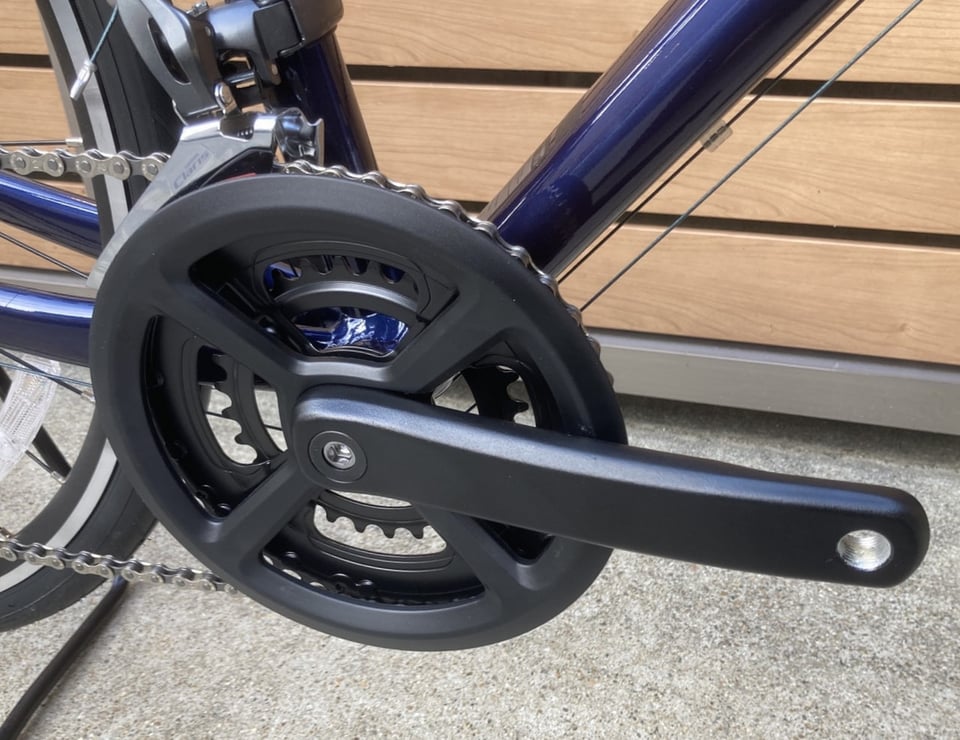 ギア廻りはしっかりとロードバイク系のコンポーネントが使われています。安心と信頼のシマノ製コンポーネント「クラリス」が使われているので、変速が正確で操作も軽く簡単に変速する事が可能。フロント変速2段 リア変速8段の合計16段変速でロードバイクより少し軽めのギア構成になっているので、初めてスポーツバイクに乗られる方でも使いやすいギアの組み合わせとなってます。ズボンの裾を巻き込まないようにバッシュガードも付いてます。優しい~