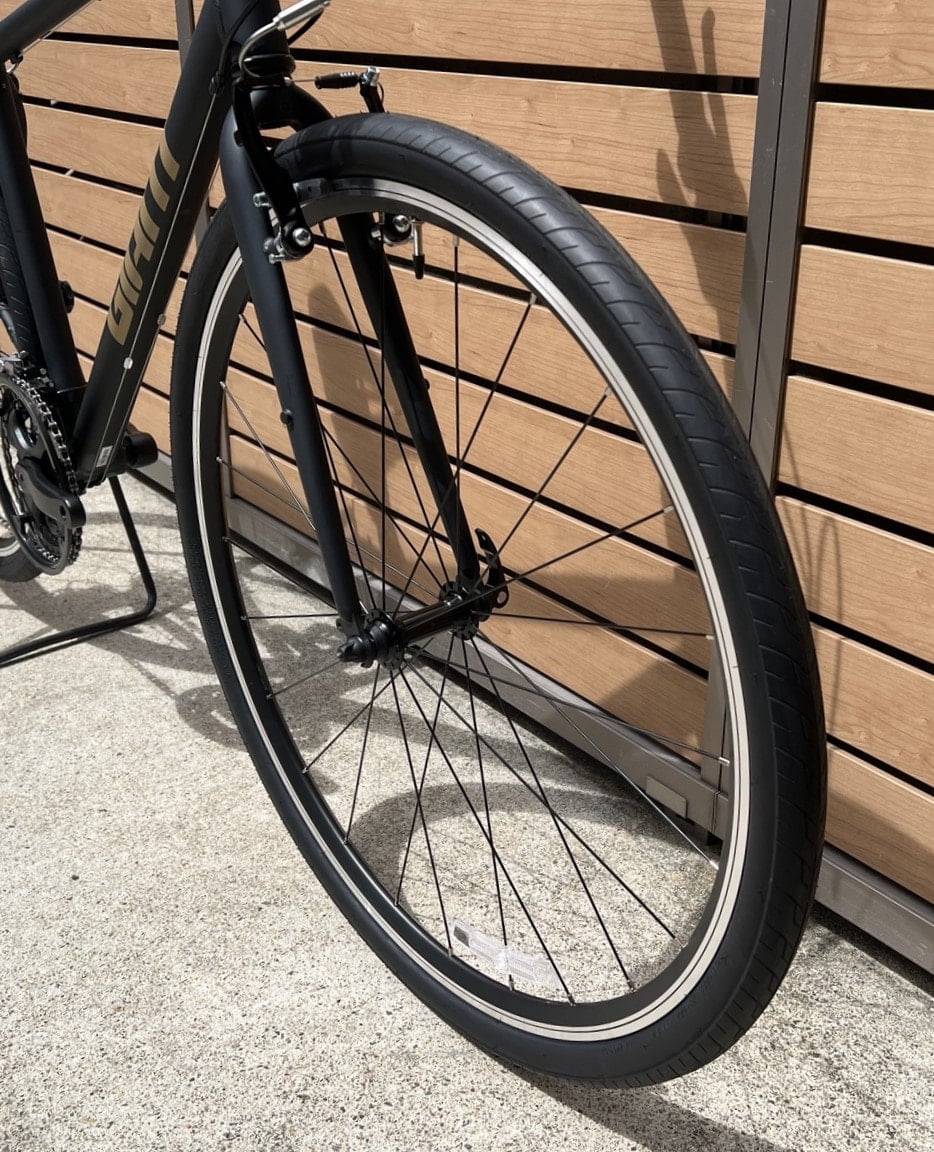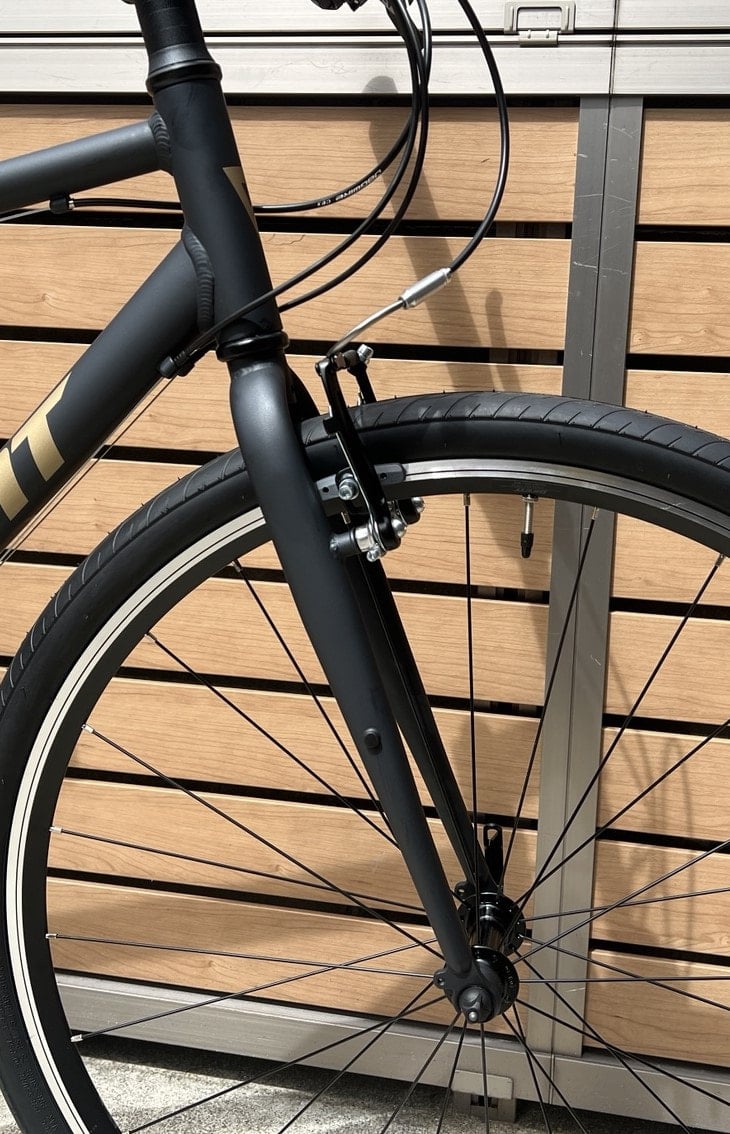 700×38Cのタイヤが採用されていて、都市部の通勤・通学から郊外の少し荒れた砂利道を含むサイクリングまで出来るクロスーオーバーバイクとなってます。ひと昔まえは700×28Cサイズのタイヤがクロスバイクの標準と言った感じでしたが、最近では段々太めのタイヤが増えて来てます。38くらい太いと一般車と同じくらいのタイヤの太さになるのでスポーツ自転車=タイヤが細くて、舗装路しか走れないという事も無くなってきてます。
