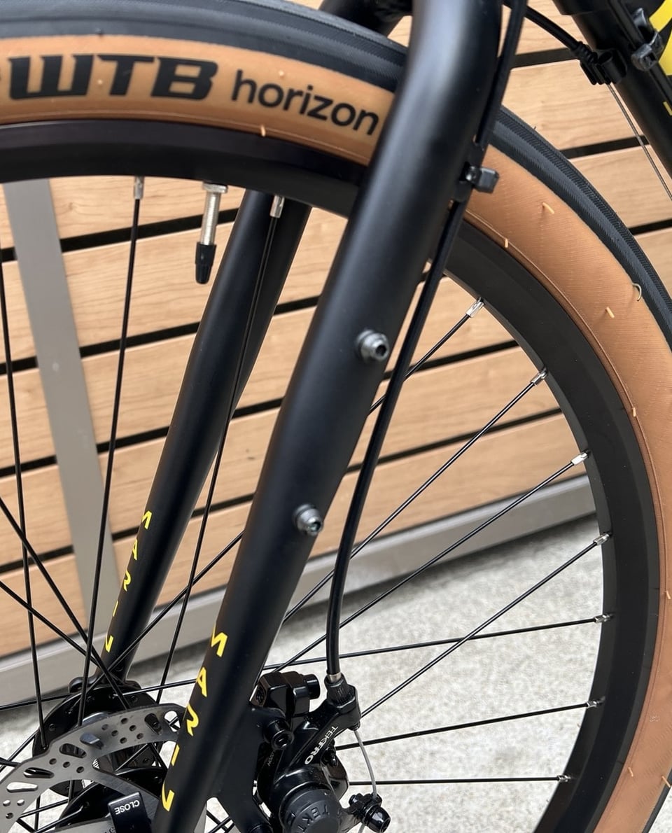 650Bx47mmの大迫力のタイヤが装着されています。荒れた道も何のその、乗る道を選ばない極太のタイヤは安定感のある乗り心地で見た目よりも軽快に走る事が出来ます。このタイヤの規格は700cホイールに28mmのタイヤの組み合わせと同じ直径になるので走行性能をあまり落とす事が無い上に太めのタイヤを入れる事が出来ます。ロードバイクとマウンテンバイクのタイヤの良い所を混ぜたようなタイヤとなってます。ある程度の互換性もあるので、少し細い物に交換したり、逆にさらに太い物を入れる事も出来ちゃいます。![]()