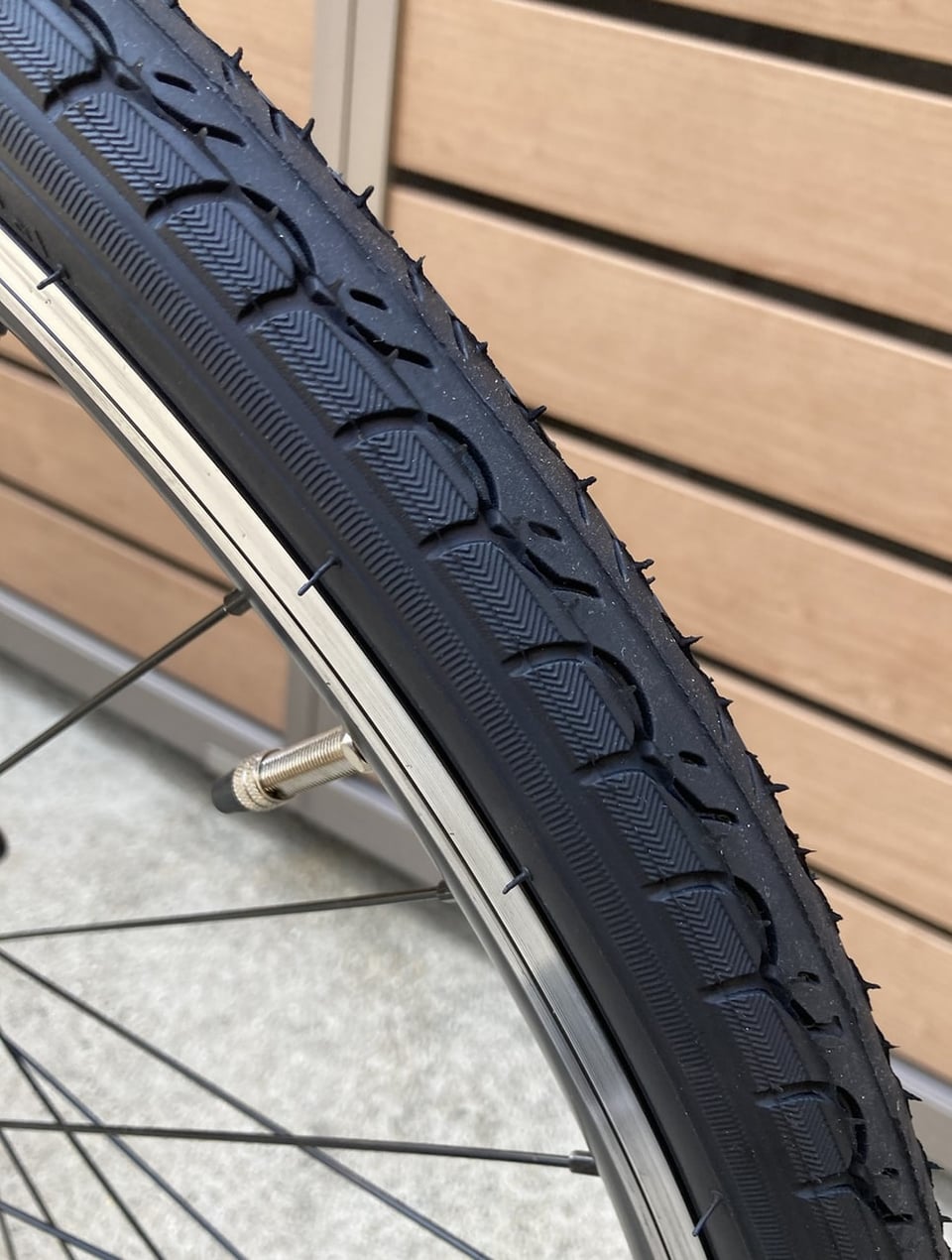 まずはタイヤサイズです。700×32Cというタイヤサイズになっていて一般車に近いタイヤの太さがあるので、スポーツバイクはタイヤが細そうで不安という方には安心のタイヤサイズとなってます。スポーツバイクですが英式のチューブが使われているので、一般車の空気入れでも空気を充填する事が可能です。ただし一般車の空気入れでは空気圧が分からない物が多いので、英式用の空気入れでも空気圧のわかる物でいくら入っているか確認しながら充填する事をおススメします。