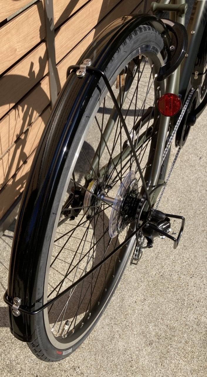 自転車やしドロヨケ付いているのは、当たり前やんって思いますよね。スポーツバイクの場合はドロヨケが付いて無い事の方が多いんです。金属製のシッカリとしたバスケットになっているので、小石が跳ねて泥除けにあたってもヘコミはしますが、割れるという事はあまり無いので悪天候の時や不意の飛び石なども安心です。![]()