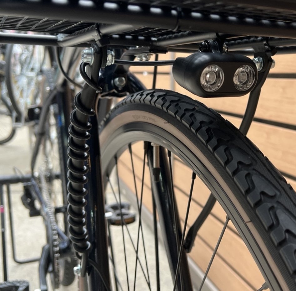 ランプヘッドは本来ハンドルバーに取り付けるタイプですが、大きめの前カゴを装備しているので、加工してカゴ下に取り付けてます。洒落てるでしょ?ランプヘッドに関しては税込みで1,320円とかなりお値段抑え目で明るさも十分です。スイッチ操作などは一切不要で常に点いているタイプのライトなので、昼間でもデイライトとして機能しますので安全です。