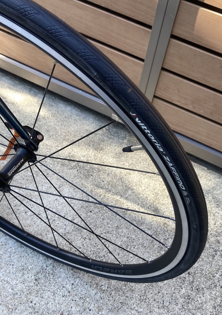 入門用のコンポーネントとありながらフォーアームのクランクとなってます。高級感のあるルックスがカッコいいですね。タイヤには700×25Cの物が装着されてます。