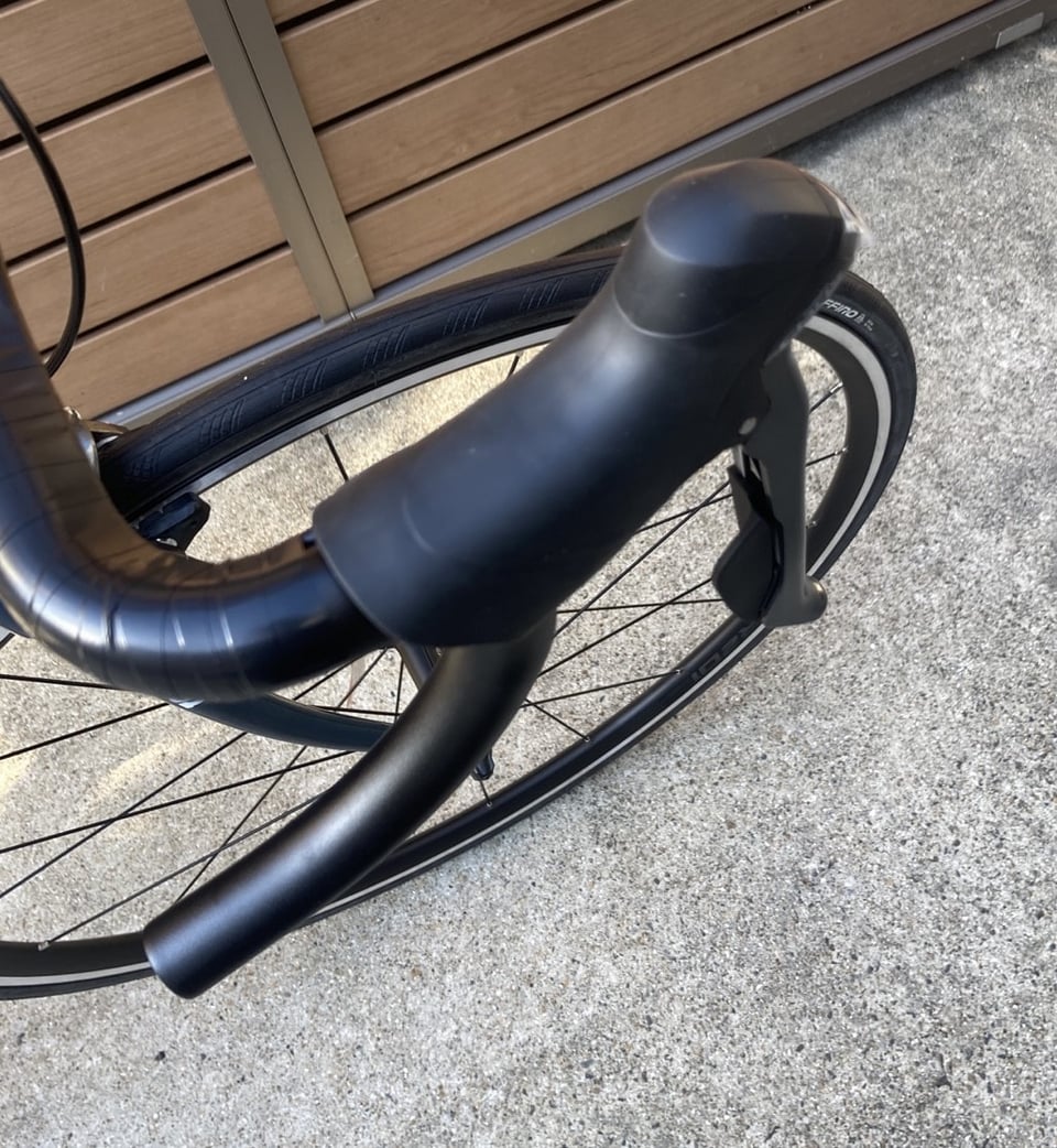 ブラケット部分を握るだけでなく、いろんな持ち方が出来るのがドロップバーの良い所。ブレーキレバーとシフトレバーが一体式になっているSTIレバーが付いてます。