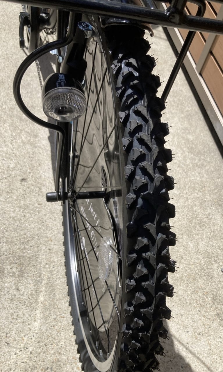 好きですね~。スポーツバイクでは無いのでガンガン悪路を攻める自転車ではありませんが、この心意気が良いじゃないですか。あえてのブロックタイヤ。好きや。![]()