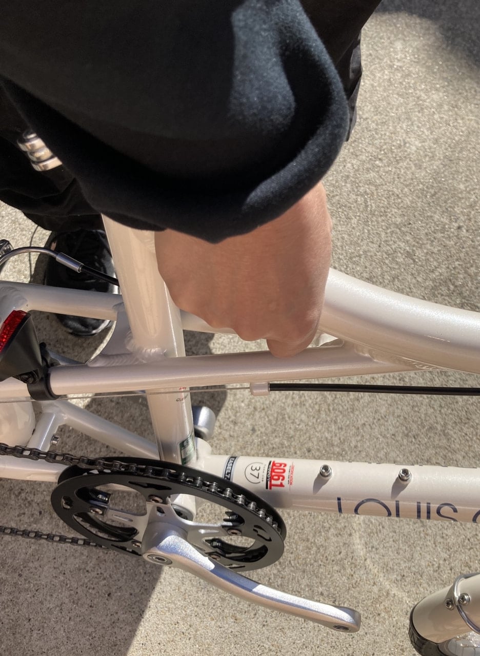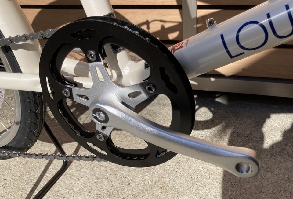 クランクにチェーンを挟み込みタイプのバッシュガードが付いているので、チェーン外れがしにくい工夫がされています。また、ズボンの裾が巻き込まれないようにもなっているので一石二鳥です。![]()