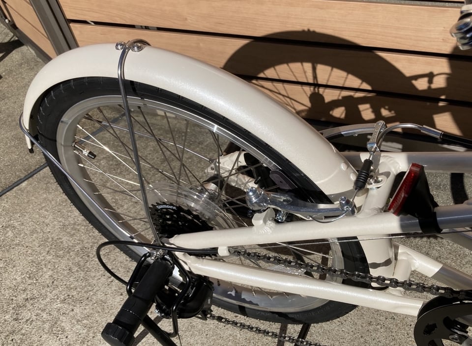 まずは前後フェンダーです。金属のフェンダーでしっかりとした物が装備されているので、悪天候や雨上がりに乗っても安心です。フレームと同色で塗装されているので、全体の一体感もありオシャレ度がアップしてます。