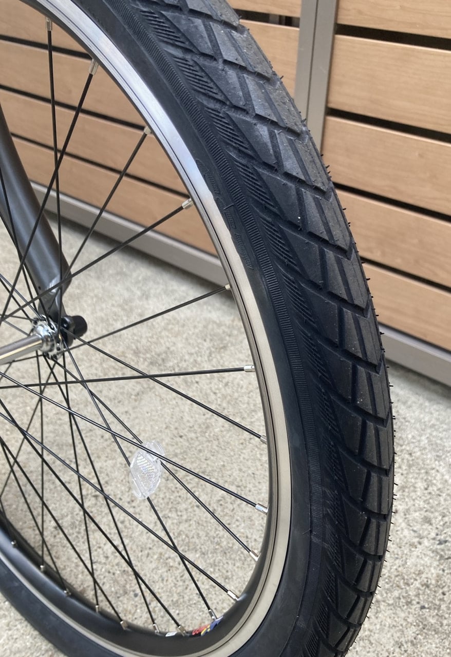 タイヤの太さも26×2.00とかなり太めのタイヤが使われています。マウンテンバイクと同じような太さでかなり迫力のあるタイヤとなってます。タイヤ太いからこぐのに力入るんちゃうん?と思った方ご安心ください。こちらは電動アシストモデルになっているので、らくらく走れちゃいます。太めのタイヤは振動吸収にも一役買っていて、地面から来る細かい振動をタイヤが吸収してくれて非常に優しい乗り心地となってます。