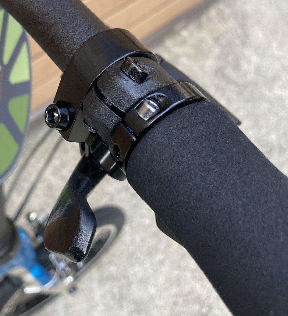 変速レバーはグリップシフトタイプでは無く、ボタンを押して変速するサムシフタータイプの物が付いてます。カチッカチッと小気味よく変速してくれるので、操作していても楽しいです。![]()