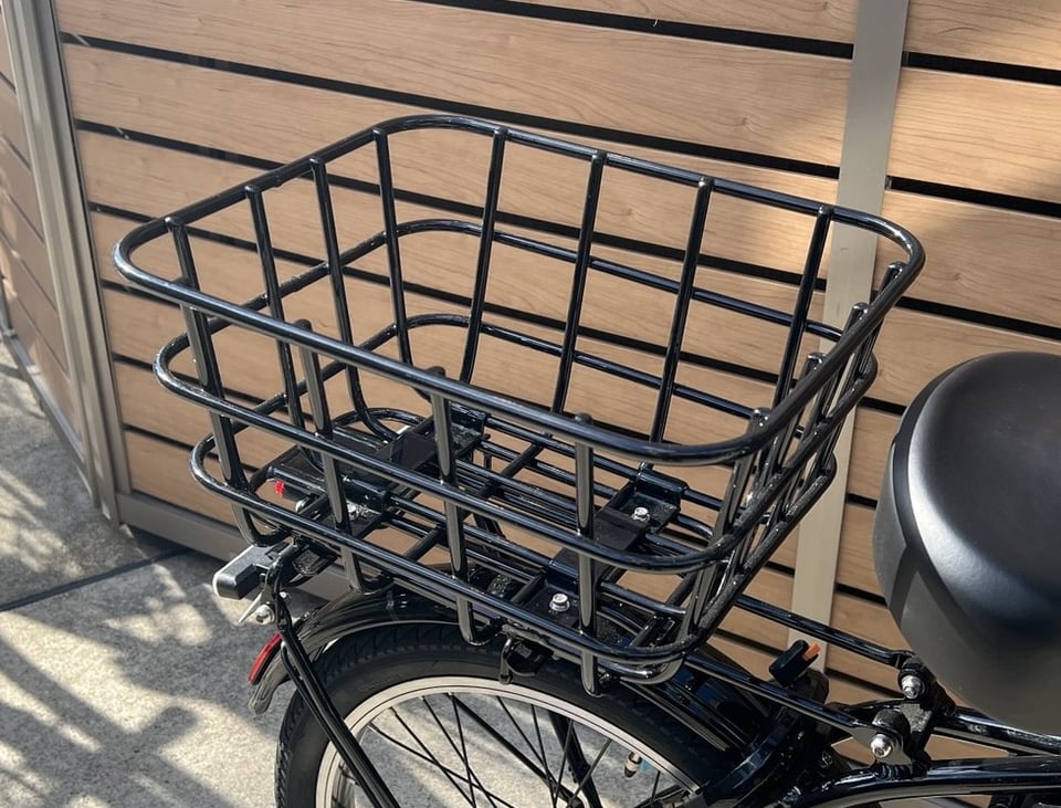 当店の試乗車にはリアカゴもお取り付けさせていただいているので、実際にお買い物でお使いいただけるかもお試しいただく事が可能です。車体の構造上、フロントバスケットの取付が難しい車体になります。