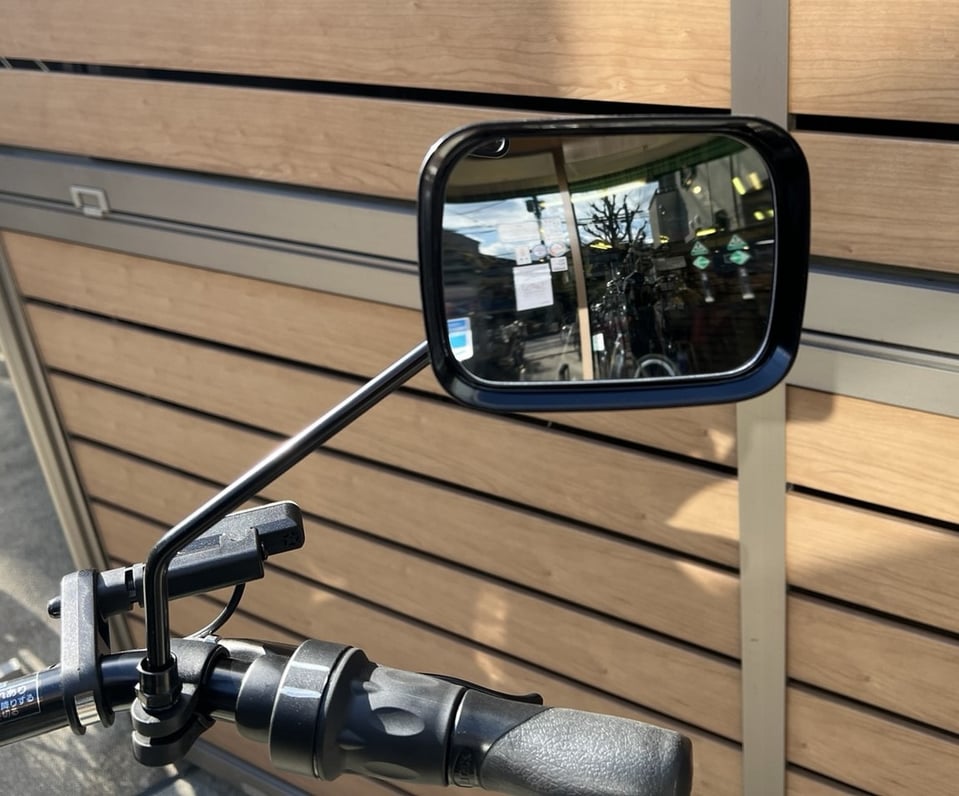はい!バックミラーです。自転車にバックミラー付けている方は少ないと思いますが侮るなかれ!付いていない時に戻れないくらい安全&安心です。私は全自転車に取付を義務化しても良いじゃ無いかと思うくらいです。