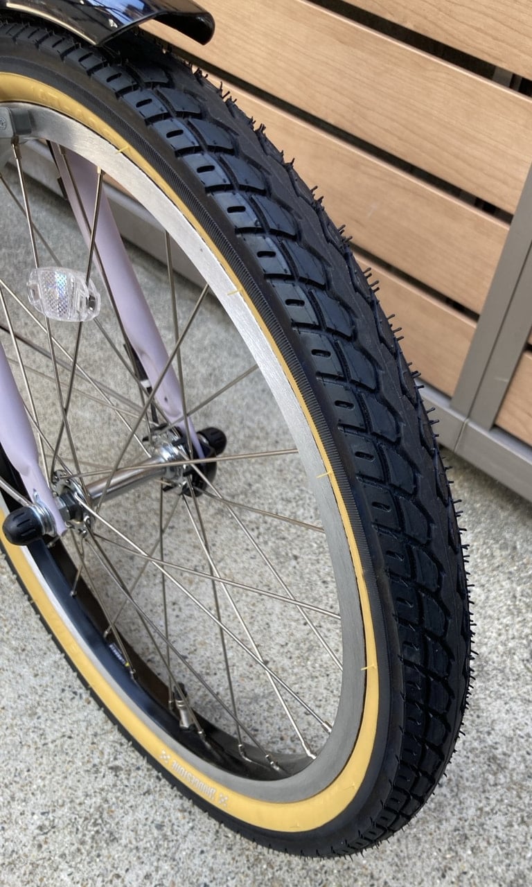 20×1.75サイズのタイヤが入っています。1.75サイズは太すぎず、細すぎない絶妙なタイヤの太さになっていて、乗っている時の安定感と重たくなり過ぎない乗り心地で扱いやすいタイヤサイズとなってます。