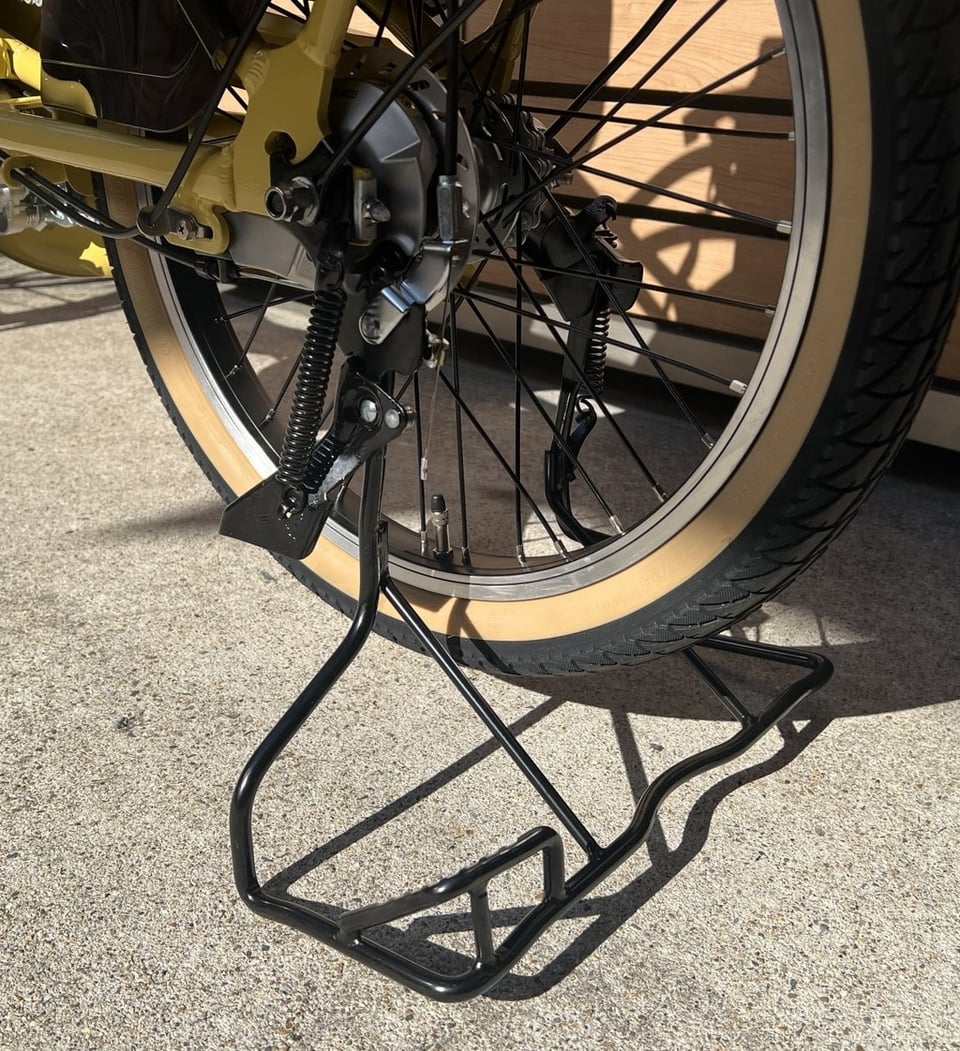 L型のスタンドは小柄な方でも足が届きやすく、テコの原理で楽々で車体を立てる事が出来ます。