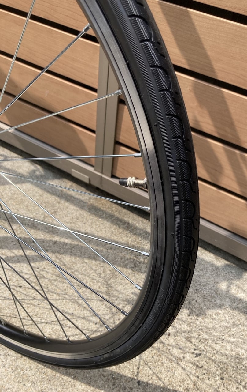 タイヤサイズが700×28C少し細めのタイヤが入ってます。最近では30C以上の太めのタイヤが多くなっている中で28Cのタイヤだと一般車には感じる事が少ない爽快な乗り味を楽しむ事が出来ます。ただし空気圧の管理はしっかりとしてくださいね!!