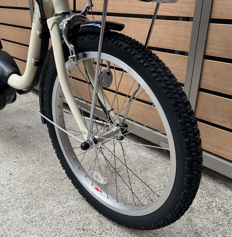 20×1.95サイズのタイヤが採用されているので、少しボリュームのあるタイヤが地面からくる不快な振動を吸収して体への負担を軽減してくれます。少しゴツゴツしたタイヤパターンで滑りにくいのも良い所。電動アシスト自転車に乗り慣れてない方にもおススメのポイントです。
