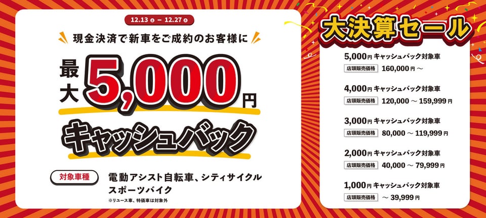 期間中に対象自転車(下記)を現金にてご成約頂いた方にもれなく全員に最大5,000円キャッシュバックします!