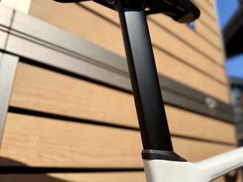 シートポストもカーボン素材で、扁平したD型の形状をしています。ここにもエアロ形状を採用しており、ただ軽いロードバイクというより、登りはもちろん平坦でも輝ける万能型のロードバイクと言えます。![]()